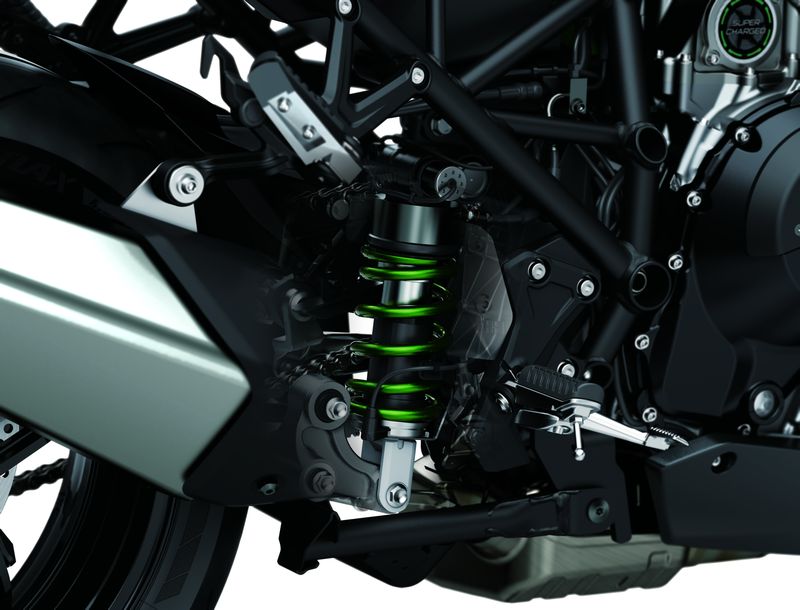 43mm inverted fork with KECS-controlled rebound and compression damping, manual spring preload adjustability and top-out springs/119 mm